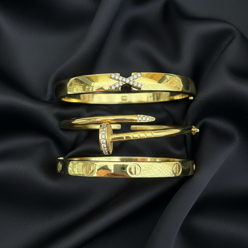 Chaque bracelet est réalisé avec un placage d’or de haute qualité, assurant un fini lumineux et une résistance exceptionnelle à l’épreuve du temps. Du jonc délicat aux chaînes sophistiquées, en passant par les designs ornés de pierres fines, notre gamme est pensée pour compléter chaque style et chaque occasion.